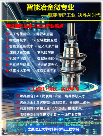学院智能冶金微专业已获批准建设。课程内容涵盖人工智能前沿、物联网技术、智能冶金新技术,并结合虚拟仿真实践、机器学习应用、电化学与储能、仿真技术案例等教学环节,深度融合人工智能、物联网与冶金工程,通过虚拟仿真与真实数据强化实战能力,致力于培养适应工业智能化转型需求的复合型人才,欢迎同学们积极报名。具体事项通知如下: