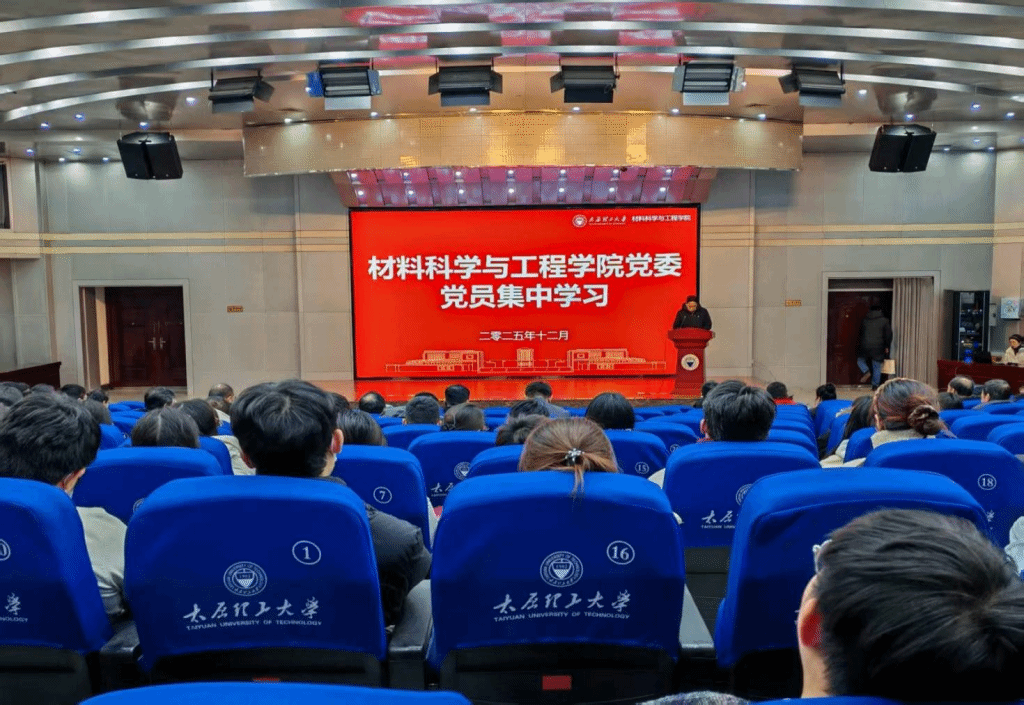 2025 年 12 月 8 日,材料科学与工程学院在迎西校区思贤楼三层报告厅召开全体党员集中学习大会,专题传达学习党的二十届四中全会精神及山西省委十二届十一次全会精神。学院党委书记游志勇主持会议并作专题辅导报告,学院全体教职工党员、学生党员参加会议,共同领悟全会精神实质,凝聚奋进力量。