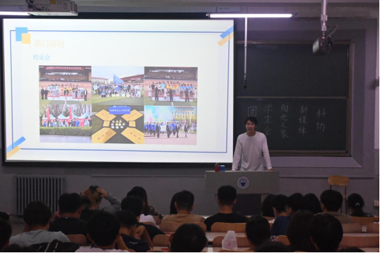晚上,机械馆2004教室座无虚席,招新宣讲会在此温馨开启。五大团学组织的代表依次登场,用生动的语言、精彩的PPT和真挚的分享,全面解读组织亮点。学生会以“桥梁纽带”为核心,详细介绍全院活动统筹、服务师生需求的职能,展现高效协作的工作风貌;阳光之家聚焦公益初心,通过志愿活动案例,传递“用爱心温暖校园”的理念,吸引着同样心怀善意的新生;学生科协围绕科技竞赛、学术采访与实验室管理,勾勒出学术探索与实践创新的成长路径,让热爱科研的学子眼前一亮;新媒体中心则用精彩的摄影作品、创意短视频,展现其在内容创作、媒体运营领域的专业实力,点燃了新生的创作热情;团委则从团务管理、思想引领与组织建设出发,诠释着青年思想引领的重要使命。宣讲过程中,学长学姐们时而幽默调侃,时而深情分享,现场掌声与笑声此起彼伏,每一份热情都化作无形的吸引力,让新生们对未来加入团学组织充满向往。