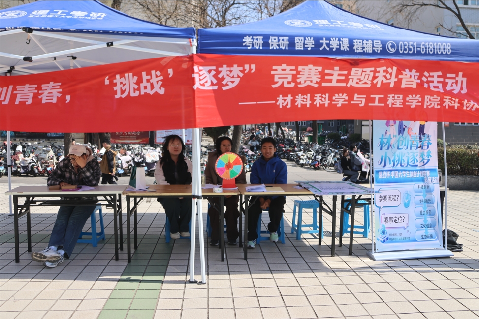 为积极响应国家“大众创业、万众创新”号召,深入推进高校创新创业教育改革,切实激发学生科创热情,3月20日,太原理工大学材料科学与工程学院科学技术协会在迎西校区清泽广场成功举办“材料青春,小挑逐梦”主题科普活动。本次活动以“解读小挑赛事、融合专业知识、点燃创新梦想”为核心,吸引了全院各年级学生积极参与,现场氛围热烈有序。