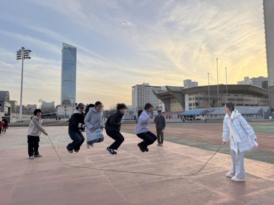 “团跃绳舞”项目则充满活力与节奏美感。该项目采用“4人跳绳+2人摇绳”的固定组合,要求参赛队伍完成10次规范跳绳动作并记录总用时。摇绳成员精准把控节奏,跳绳成员紧盯绳影同步跳跃,有的队伍凭借娴熟配合一气呵成,有的队伍在调整中逐渐找到默契,现场掌声与欢呼声此起彼伏。这个项目不仅锻炼了同学们的肢体协调性,更让宿舍团队在轻快的跃动中提升了节奏同步的默契度。